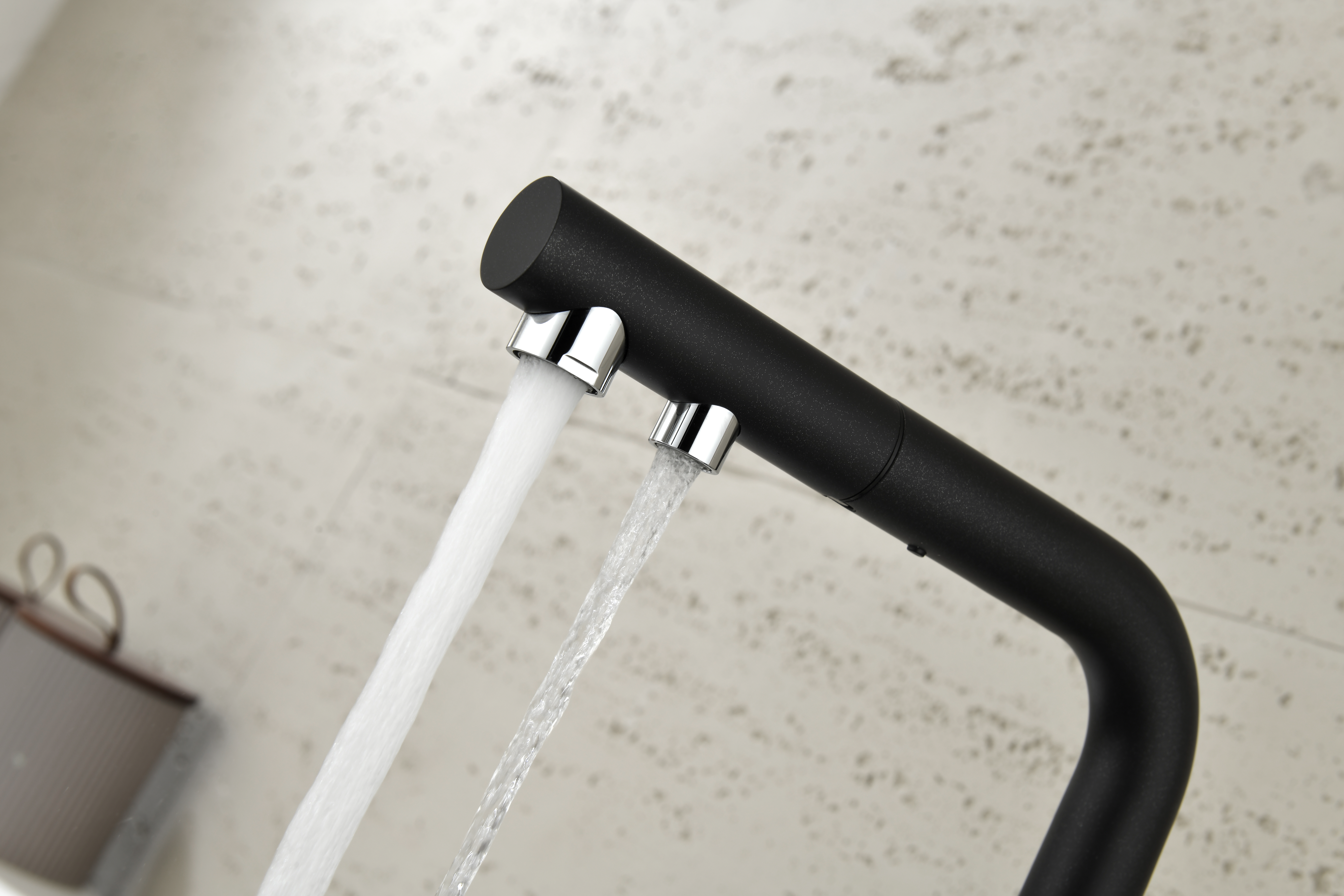SERPENTINE оснащён функцией TRINKWASSER - излив смесителя имеет встроенный независимый канал для питьевой воды из фильтра, таким образом питьевая и водопроводная вода не смешиваются. Управление питьевой водой осуществляется отдельным рычагом, расположенным слева. Для пуска водопроводной воды используется большой рычаг справа.