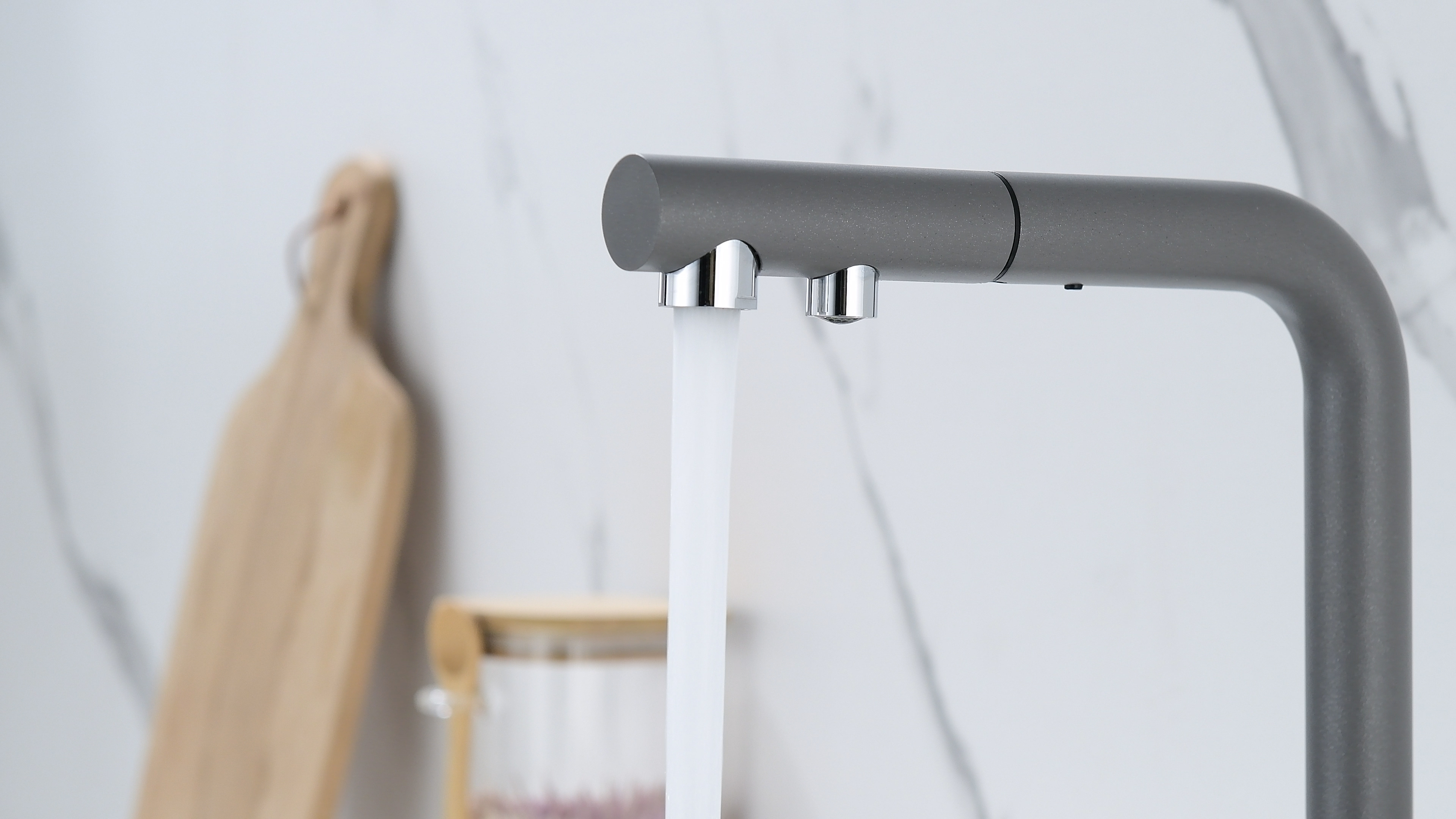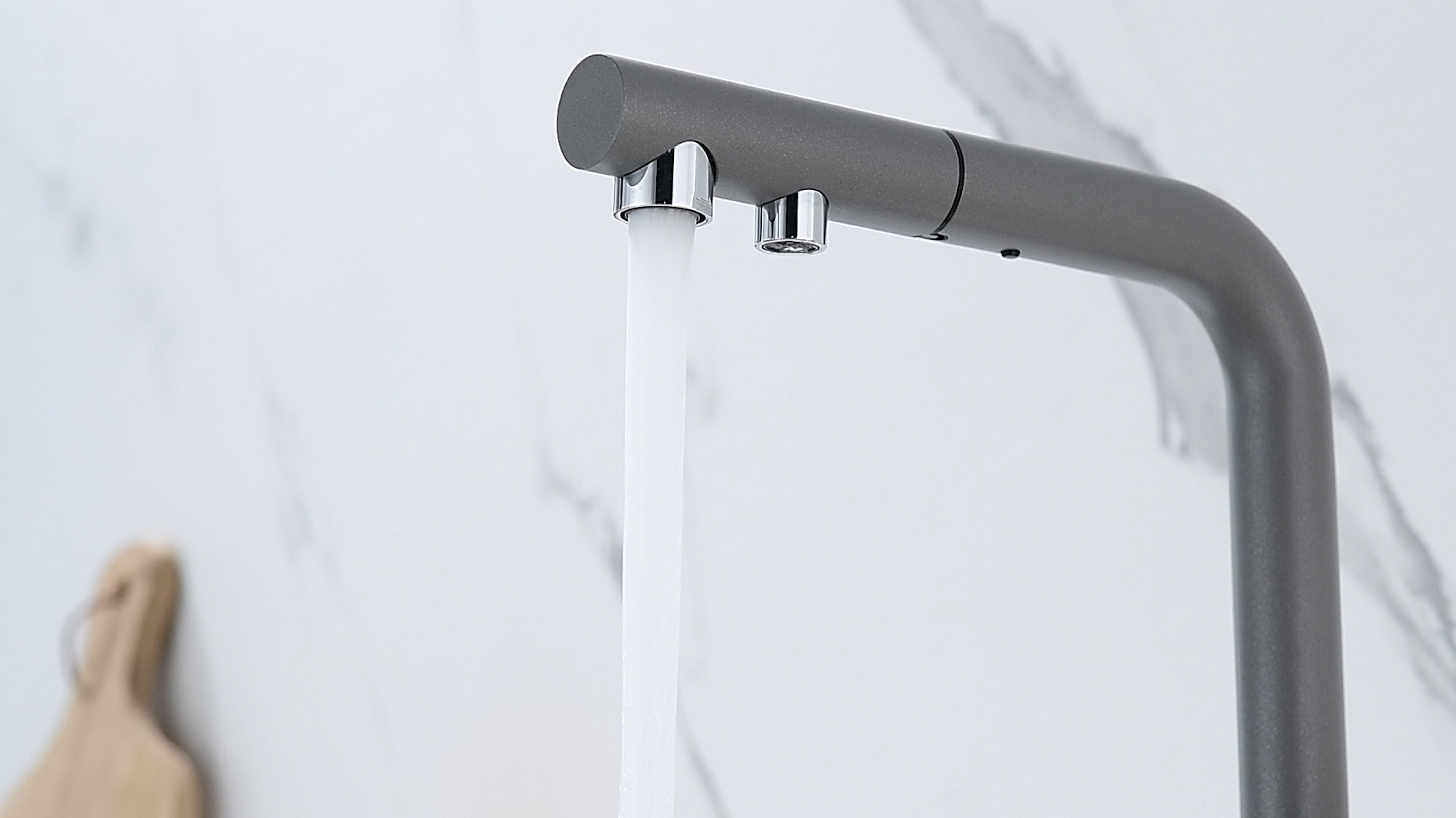 SERPENTINE оснащён функцией TRINKWASSER - излив смесителя имеет встроенный независимый канал для питьевой воды из фильтра, таким образом питьевая и водопроводная вода не смешиваются. Управление питьевой водой осуществляется отдельным рычагом, расположенным слева. Для пуска водопроводной воды используется большой рычаг справа.