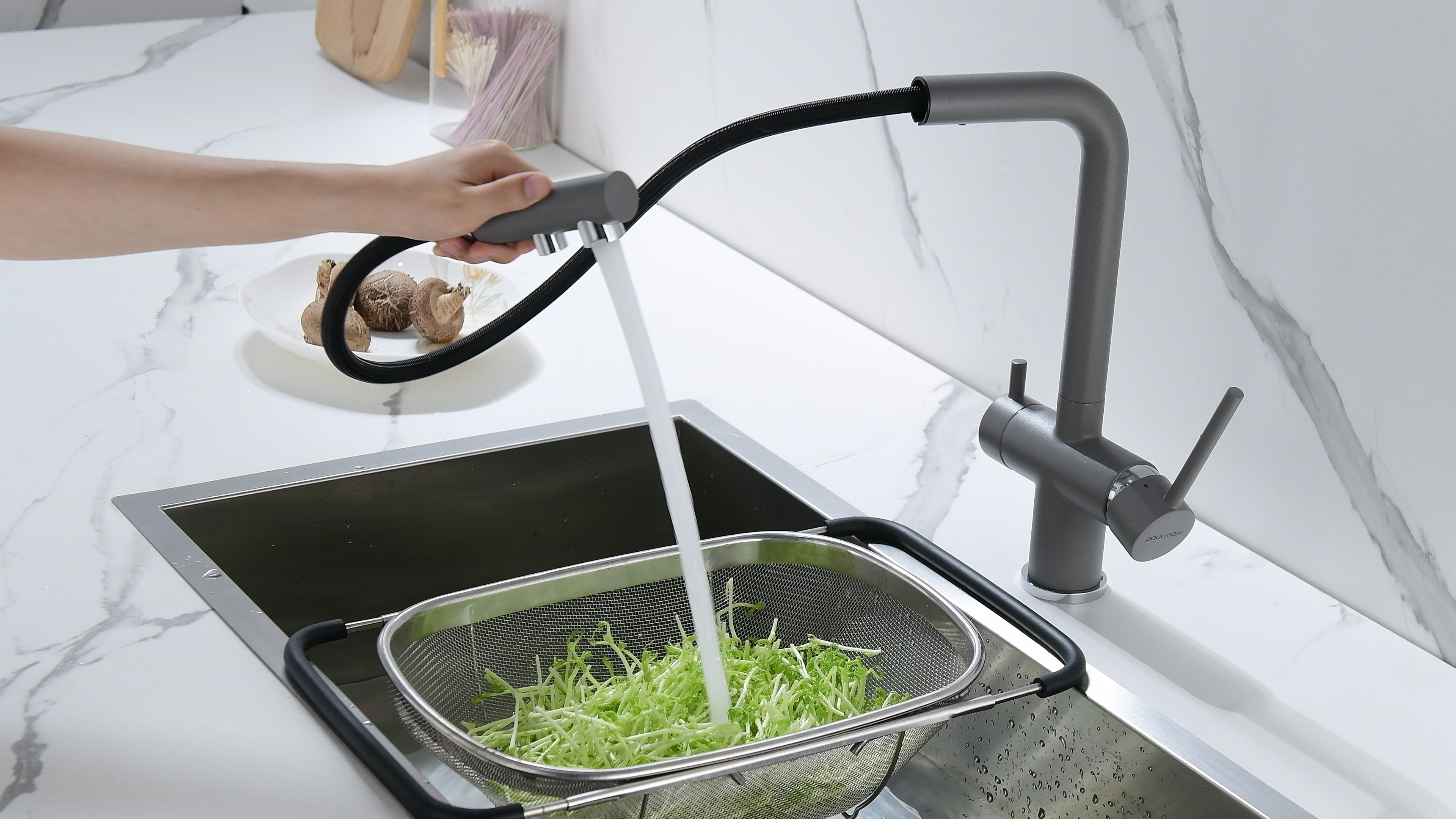 Смеситель оснащен гибким выдвижным изливом из нейлоновой оплетки, которая обладает отличной устойчивостью к истиранию и разрушению. Данная техническая особенность расширяет рабочую зону смесителя, позволяя пользоваться им с удобством в больших мойках, мойках с двумя чашами, или наполнять водой ёмкость на столе рядом с мойкой, в том числе питьевой водой.