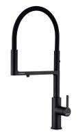 Гибкий силиконовый излив оснащен функцией деликатного душа и магнитным механизмом фиксации в задней части латунного корпуса. Он позволяет ополоснуть посуду или мойку в любой ее части или наполнить емкости даже на столе рядом с мойкой.