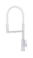 Гибкий силиконовый излив оснащен функцией деликатного душа и магнитным механизмом фиксации в задней части латунного корпуса. Он позволяет ополоснуть посуду или мойку в любой ее части или наполнить емкости даже на столе рядом с мойкой.